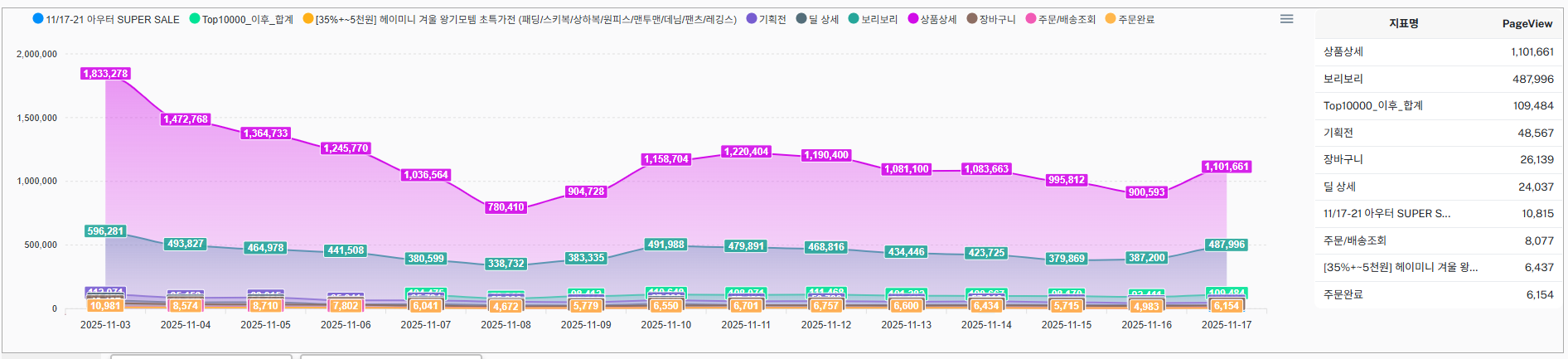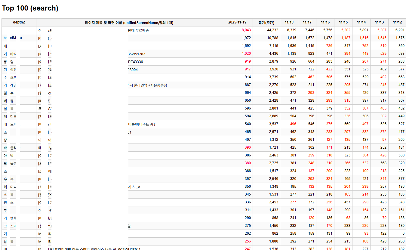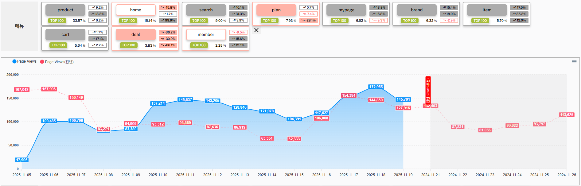 ❖ 메뉴별 방문 추이 ✔️ 홈 방문 ✔️ 상품 및 상품별 추이 ✔️ 검색 횟수 및 검색어 추이 ✔️ 기획전 방문 ✔️ 기타 메뉴별 |