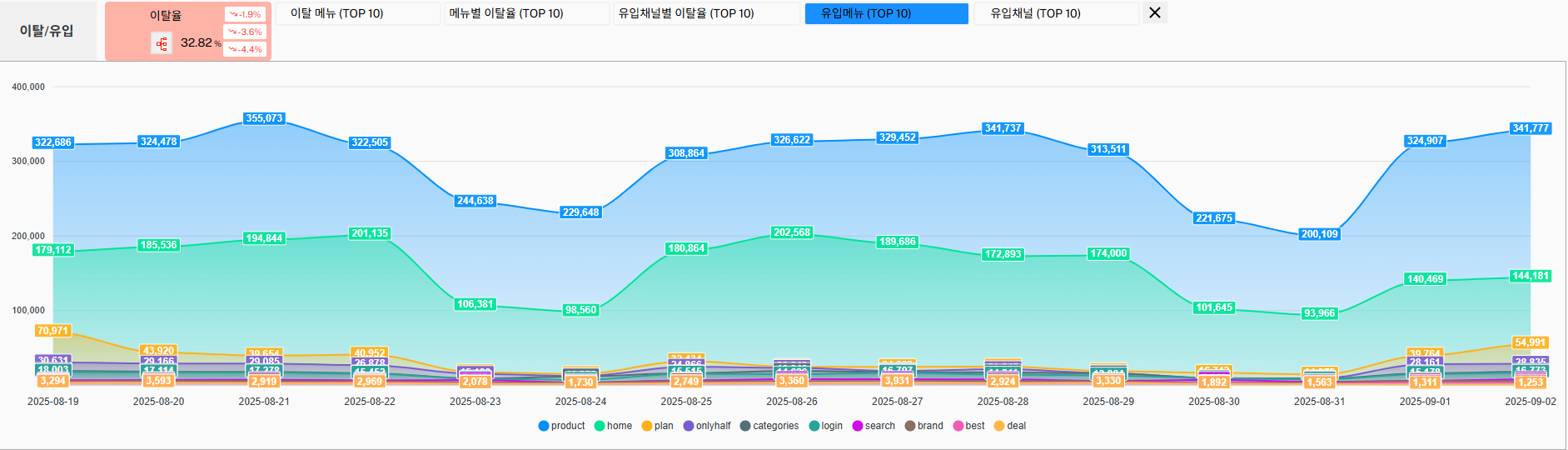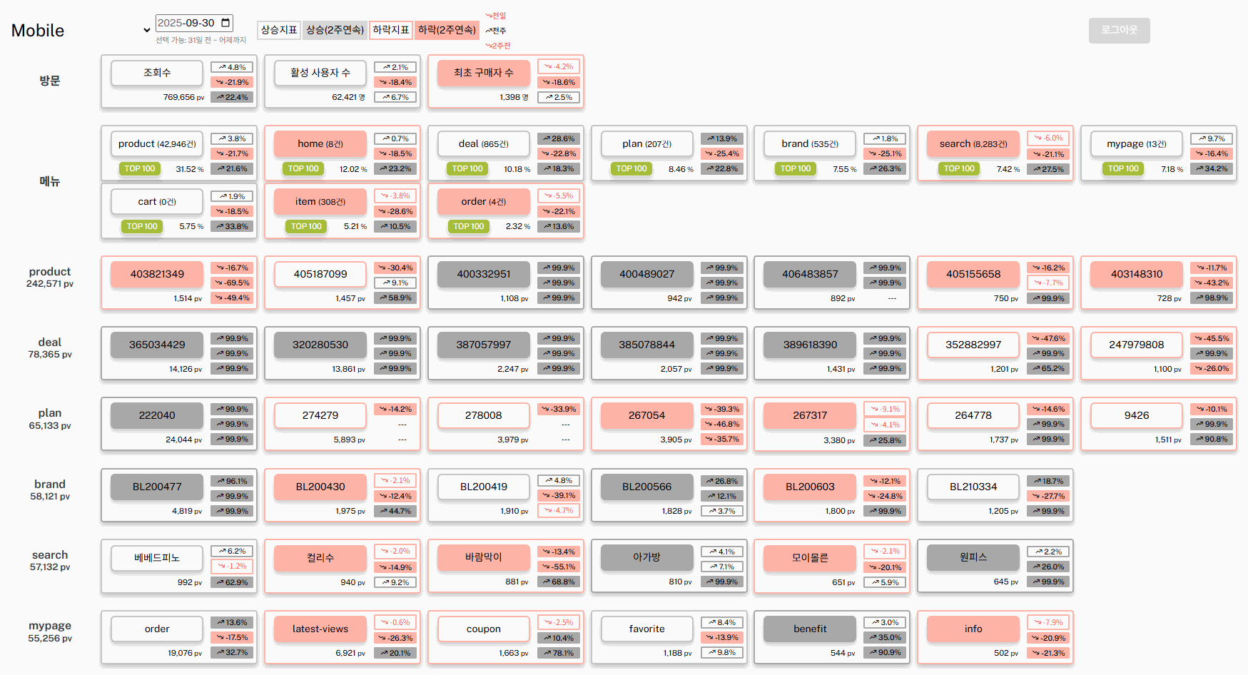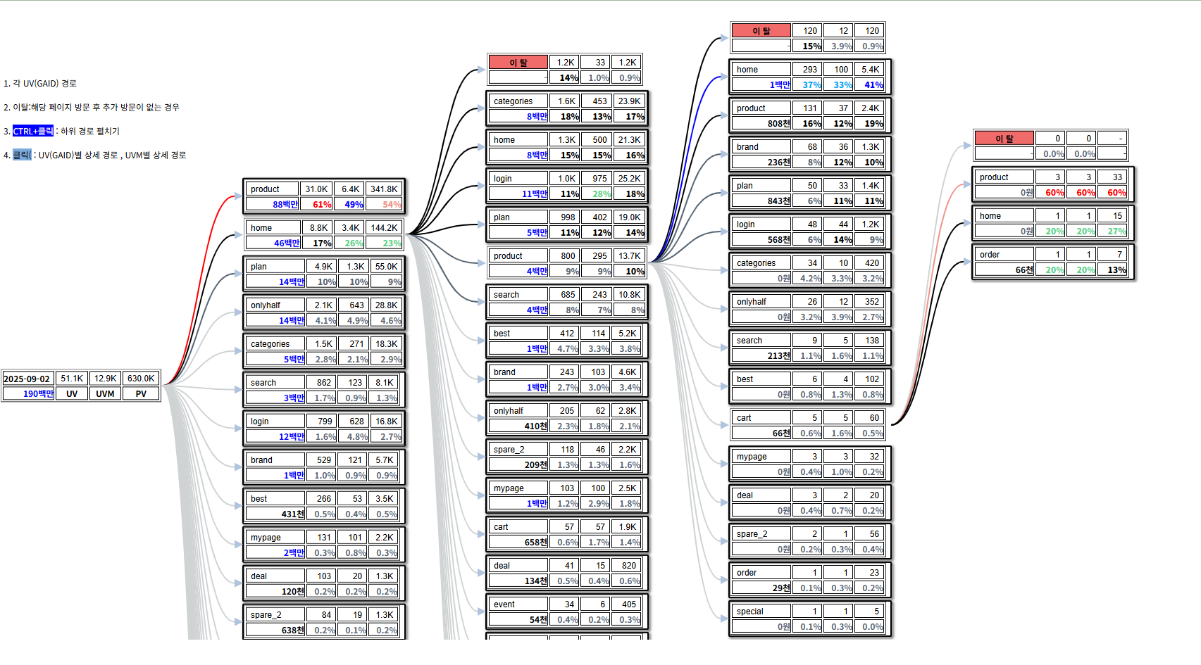 ❖ 메뉴별 방문 추이 ✔️ 홈 방문 ✔️ 상품 및 상품별 추이 ✔️ 검색 횟수 및 검색어 추이 ✔️ 기획전 방문 ✔️ 기타 메뉴별 |