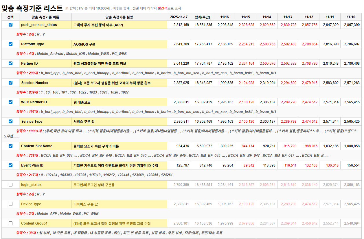 ❖ 고급 사용자를 위한 편리성 증대 ✔️ 전체 속성 리스트 확인 가능 ✔️ 맞춤 정의 (사용자 Tag) 추가시 자동 인식 ✔️ 속성의 단수, 복수로 대시 보드 생성 ✔️ 중복, 미사용 속성 확인 가능 ✔️ 데이터 건수 제한 없음 (최대 500건 제한 없음) |