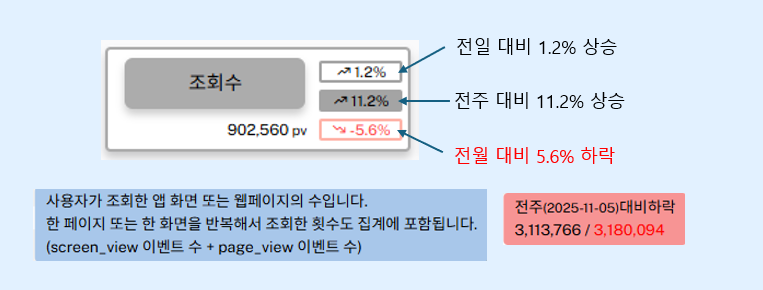 ❖ 전일·전주·전월 대비 ✔️ 비율 이외 상세 정보 표시 ✔️ 상승.하락 추이 ✔️ 지표 설명 |