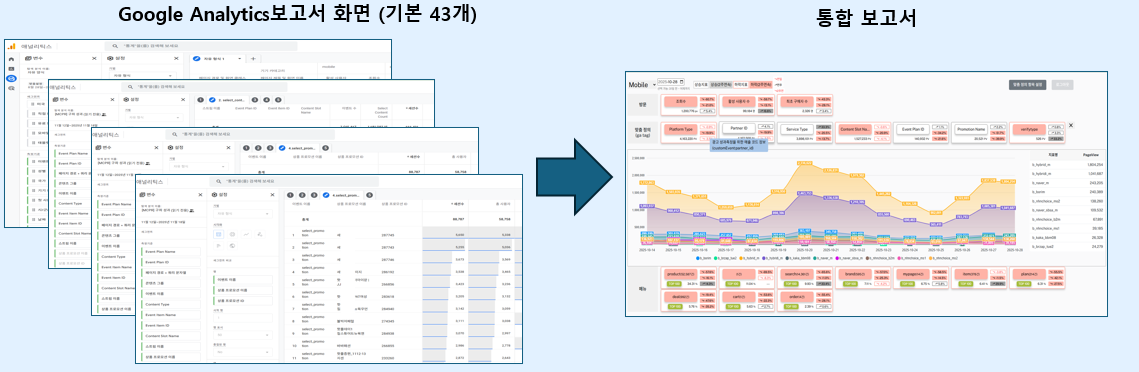 ❖ GA 설치 후에도 어렵습니다. ✔️ 범용성에 의한 편리성 부족. (통합 보고서 생성 불가, 약 40개 지표 조회/일 ) ✔️ 건별 조회로 효율성 저하. (평균 1.5시간 소요/일) ✔️ 방대한 데이터로 이슈 도출 어려움. (BigQuery 사용, 유료) ✔️ 데이터 분석을 위한 GA 담당자 필요. (GA / GTM / 데이터 분석 숙련자) ✔️ 데이터 분석 도구 추가 필요. (Excel, Tableau 등) ✔️ 맞춤 정의(사용자 Tag) 관리 불가. (중복 설정, 미사용 속성 등) |
