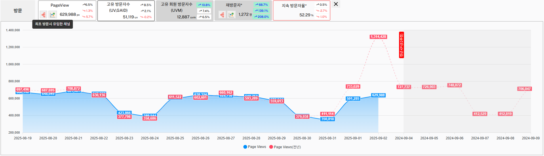 ❖ 방문 분석 및 예측 가능 ✔️ 최근 2주간 데이터로 상승·하락 추이 확인 ✔️ 전년 데이터 분석으로 향후 1주일 방문 예측 가능 ✔️ 다수 지표에 대한 동시 비교 가능 |